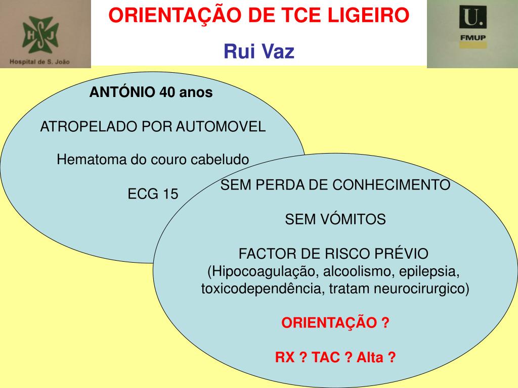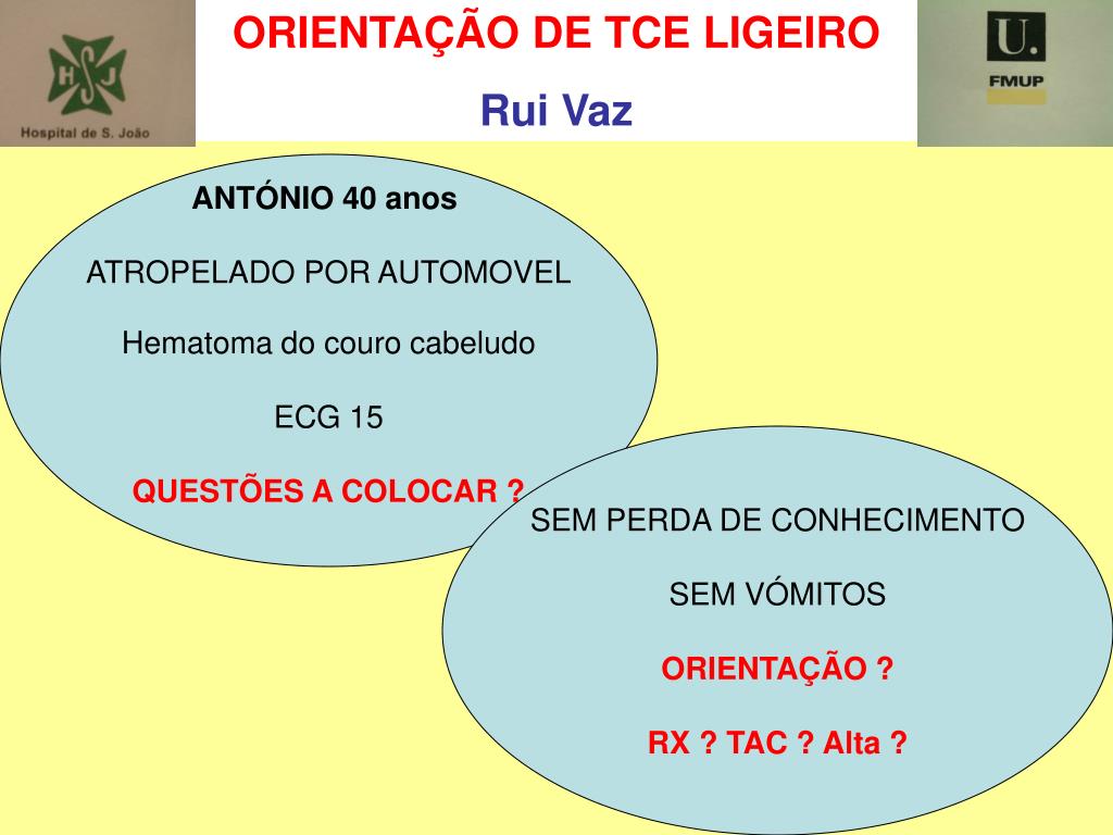 ORIENTAÇÃO DE TCE LIGEIRO Rui Vaz. ANTÓNIO 40 anos ATROPELADO POR AUTOMOVEL Hematoma do couro cabeludo ECG 15 QUESTÕES A COLOCAR ?. SEM PERDA DE CONHECIMENTO SEM VÓMITOS ORIENTAÇÃO ? RX ? TAC ? Alta ?. ORIENTAÇÃO DE TCE LIGEIRO Rui Vaz. ALTA SOB VIGILÂNCIA FAMILIAR.