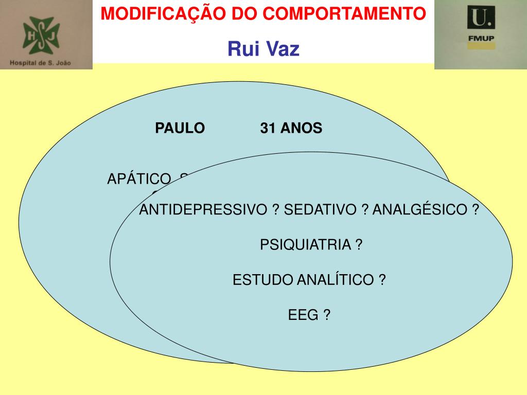 MODIFICAÇÃO DO COMPORTAMENTO Rui Vaz PAULO 31 ANOS APÁTICO, SONOLENTO, DIFERENTE, CEFALEIAS OCASIONAIS EXAME NEUROLÓGICO NORMAL QUE ORIENTAÇÃO ? ANTIDEPRESSIVO ? SEDATIVO ? ANALGÉSICO ? PSIQUIATRIA ? ESTUDO ANALÍTICO ? EEG ?