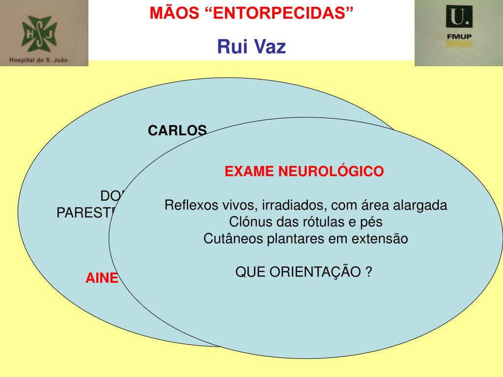 MÃOS “ENTORPECIDAS” Rui Vaz CARLOS 71 ANOS CERVICALGIAS ANTIGAS DORES NOS MEMBROS SUPERIORES PARESTESIAS E PERDA DE AGILIDADE DAS MÃOS QUE ORIENTAÇÃO ? AINE ? FISIATRIA ? RX ? OUTRO EXAME ? EXAME NEUROLÓGICO Reflexos vivos, irradiados, com área alargada Clónus das rótulas e pés Cutâneos plantares em extensão QUE ORIENTAÇÃO ?