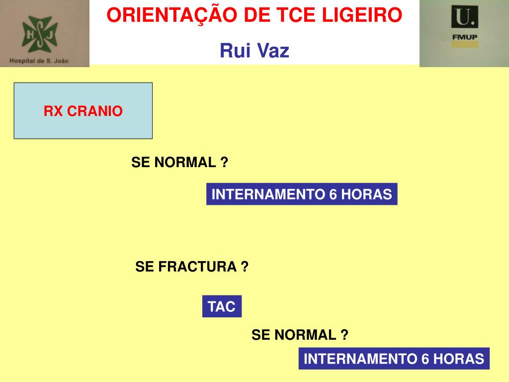 ORIENTAÇÃO DE TCE LIGEIRO Rui Vaz RX CRANIO SE NORMAL ? INTERNAMENTO 6 HORAS SE FRACTURA ? TAC SE NORMAL ? INTERNAMENTO 6 HORAS