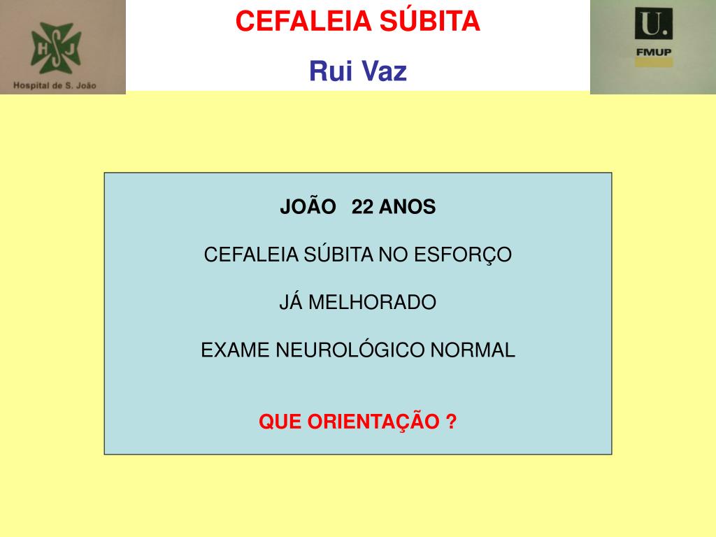 CEFALEIA SÚBITA Rui Vaz JOÃO 22 ANOS CEFALEIA SÚBITA NO ESFORÇO JÁ MELHORADO EXAME NEUROLÓGICO NORMAL QUE ORIENTAÇÃO ?