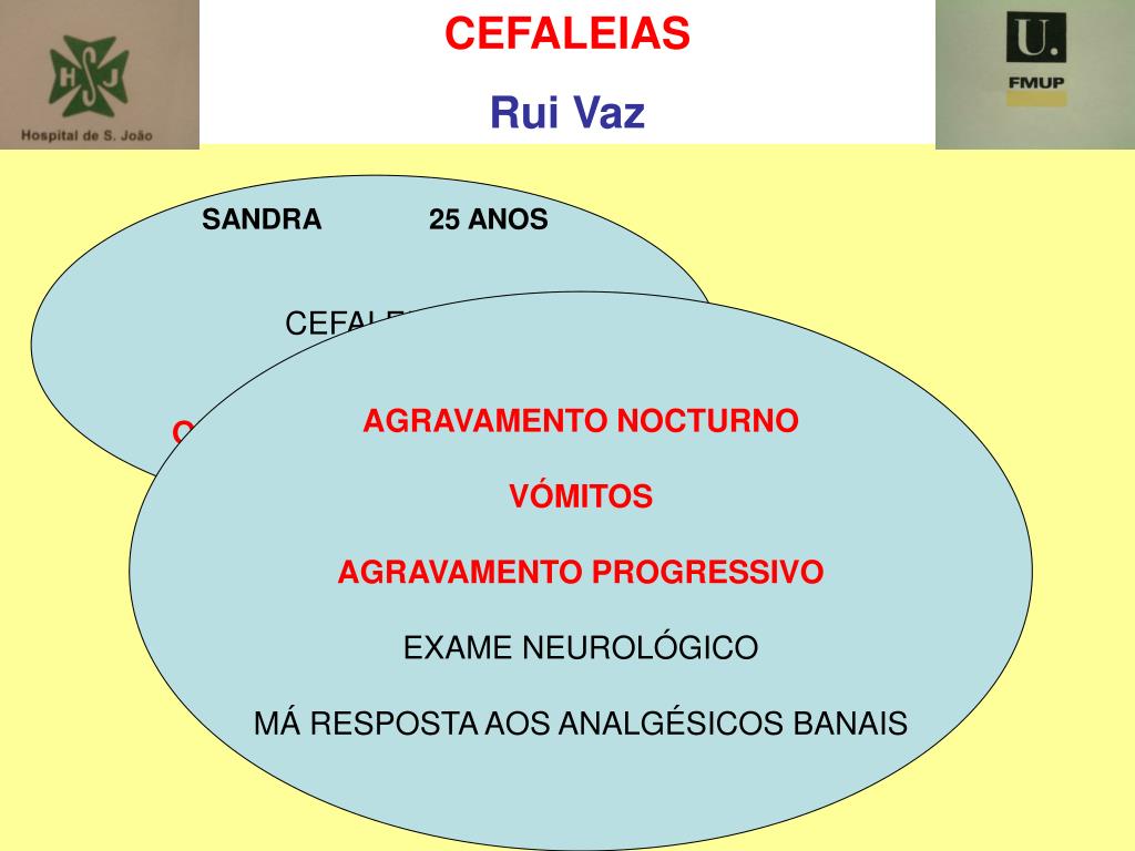 CEFALEIAS Rui Vaz SANDRA 25 ANOS CEFALEIAS QUE CARACTERÍSTICAS ? AGRAVAMENTO NOCTURNO VÓMITOS AGRAVAMENTO PROGRESSIVO EXAME NEUROLÓGICO MÁ RESPOSTA AOS ANALGÉSICOS BANAIS