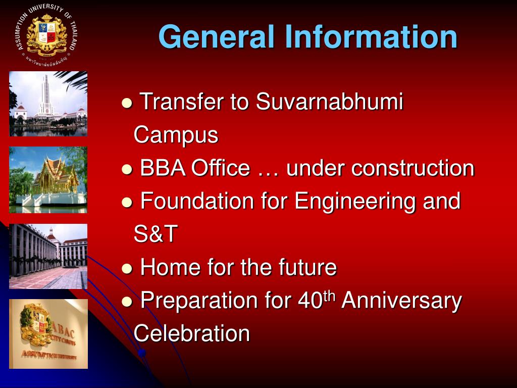 General Information • Transfer to Suvarnabhumi Campus • BBA Office … under construction • Foundation for Engineering and S&T • Home for the future • Preparation for 40th Anniversary Celebration