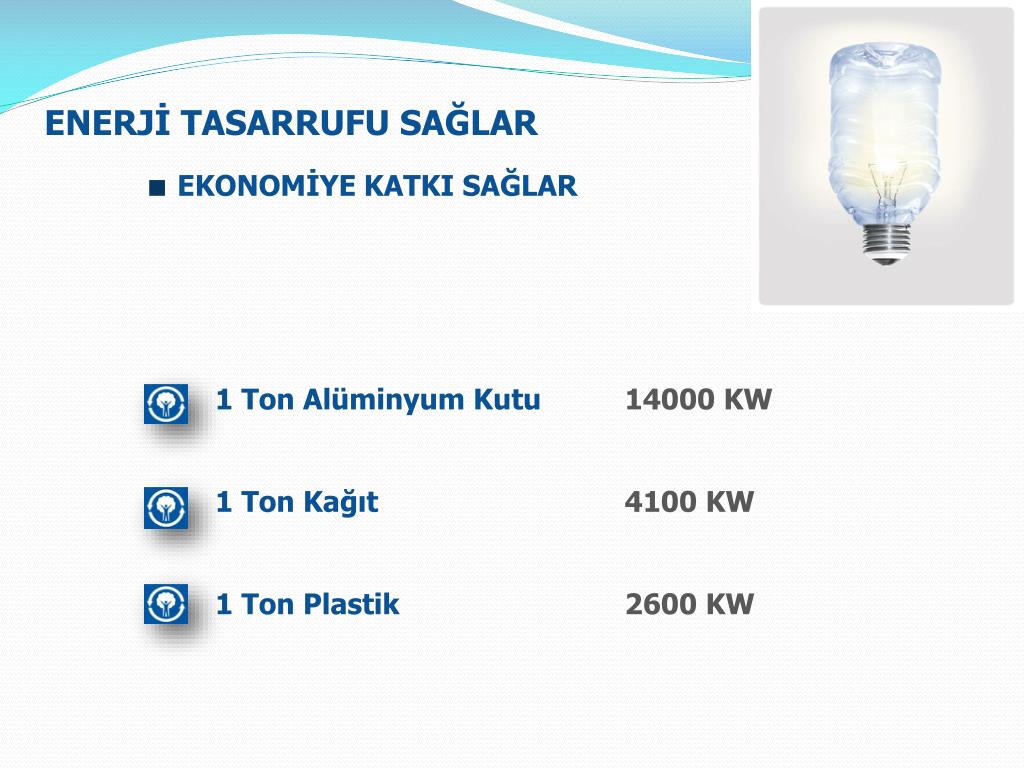 ENERJİ TASARRUFU SAĞLAR ■EKONOMİYE KATKI SAĞLAR • 1 Ton Alüminyum Kutu 14000 KW • 1 Ton Kağıt 4100 KW • 1 Ton Plastik 2600 KW