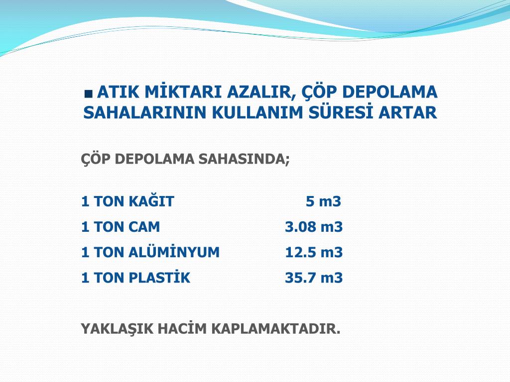■ATIK MİKTARI AZALIR, ÇÖP DEPOLAMA SAHALARININ KULLANIM SÜRESİ ARTAR ÇÖP DEPOLAMA SAHASINDA; 1 TON KAĞIT 5 m3 1 TON CAM 3.08 m3 1 TON ALÜMİNYUM 12.5 m3 1 TON PLASTİK 35.7 m3 YAKLAŞIK HACİM KAPLAMAKTADIR.