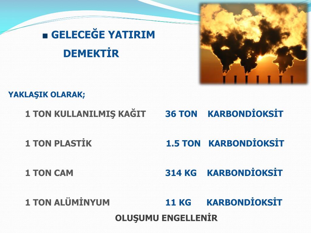 ■GELECEĞE YATIRIM DEMEKTİR YAKLAŞIK OLARAK; 1 TON KULLANILMIŞ KAĞIT36 TON KARBONDİOKSİT 1 TON PLASTİK 1.5 TON KARBONDİOKSİT 1 TON CAM314 KG KARBONDİOKSİT 1 TON ALÜMİNYUM11 KGKARBONDİOKSİT OLUŞUMU ENGELLENİR