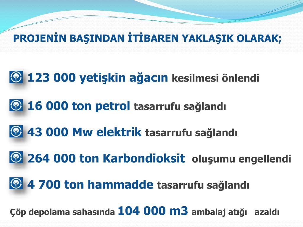 PROJENİN BAŞINDAN İTİBAREN YAKLAŞIK OLARAK; 123 000 yetişkin ağacın kesilmesi önlendi 16 000 ton petrol tasarrufu sağlandı 43 000 Mw elektrik tasarrufu sağlandı 264 000 ton Karbondioksit oluşumu engellendi 4 700 ton hammadde tasarrufu sağlandı Çöp depolama sahasında 104 000 m3 ambalaj atığı azaldı