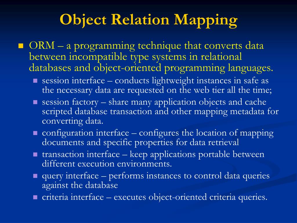 Object Relation Mapping • ORM – a programming technique that converts data between incompatible type systems in relational databases and object-oriented programming languages. • session interface – conducts lightweight instances in safe as the necessary data are requested on the web tier all the time; • session factory – share many application objects and cache scripted database transaction and other mapping metadata for converting data. • configuration interface – configures the location of mapping documents and specific properties for data retrieval • transaction interface – keep applications portable between different execution environments. • query interface – performs instances to control data queries against the database • criteria interface – executes object-oriented criteria queries.