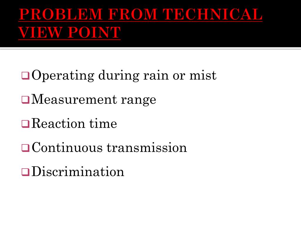 PROBLEM FROM TECHNICAL VIEW POINT • Operating during rain or mist • Measurement range • Reaction time • Continuous transmission • Discrimination