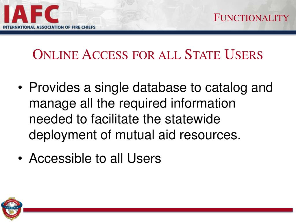 Functionality Online Access for all State Users • Provides a single database to catalog and manage all the required information needed to facilitate the statewide deployment of mutual aid resources. • Accessible to all Users
