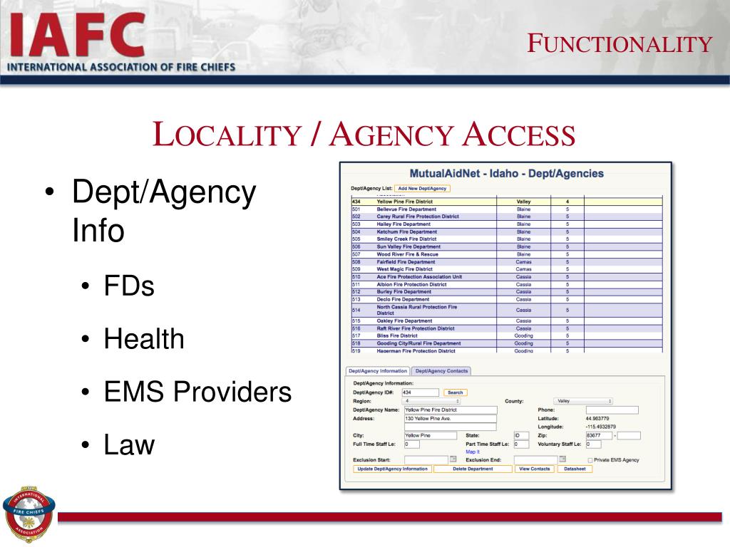 Functionality Locality / Agency Access • Dept/Agency Info • FDs • Health • EMS Providers • Law