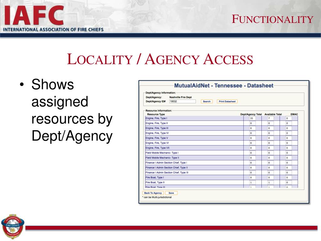 Functionality Locality / Agency Access • Shows assigned resources by Dept/Agency