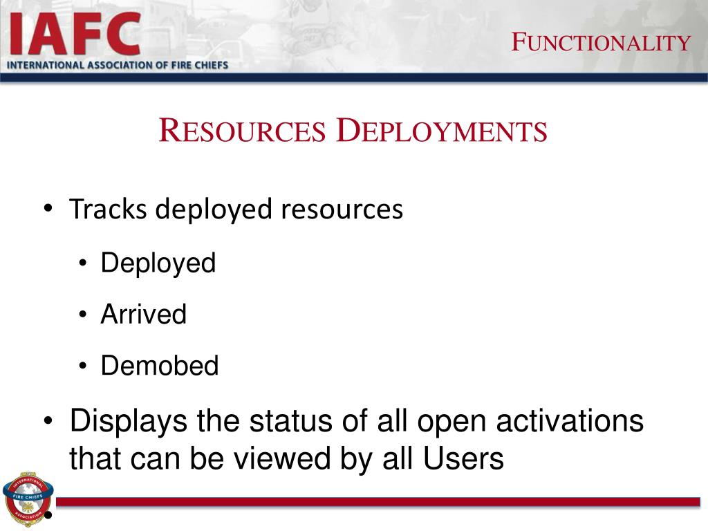 Functionality Resources Deployments • Tracks deployed resources • Deployed • Arrived • Demobed • Displays the status of all open activations that can be viewed by all Users