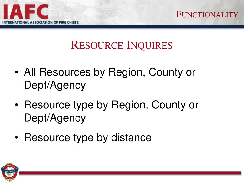 Functionality Resource Inquires • All Resources by Region, County or Dept/Agency • Resource type by Region, County or Dept/Agency • Resource type by distance