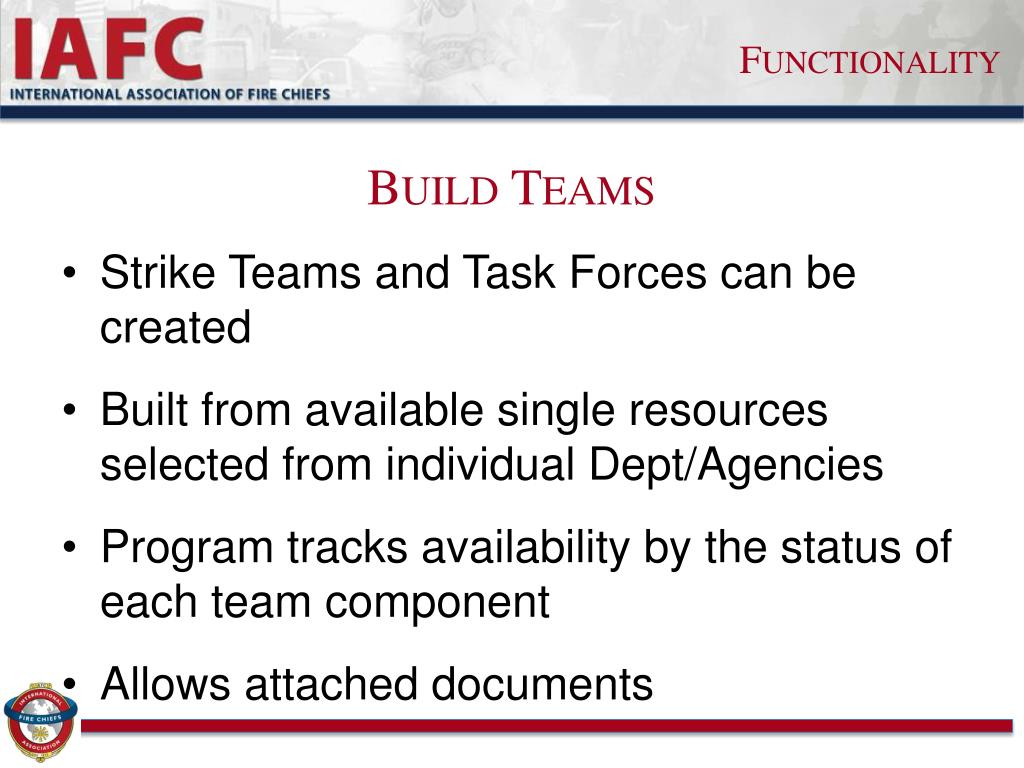 Functionality Build Teams • Strike Teams and Task Forces can be created • Built from available single resources selected from individual Dept/Agencies • Program tracks availability by the status of each team component • Allows attached documents