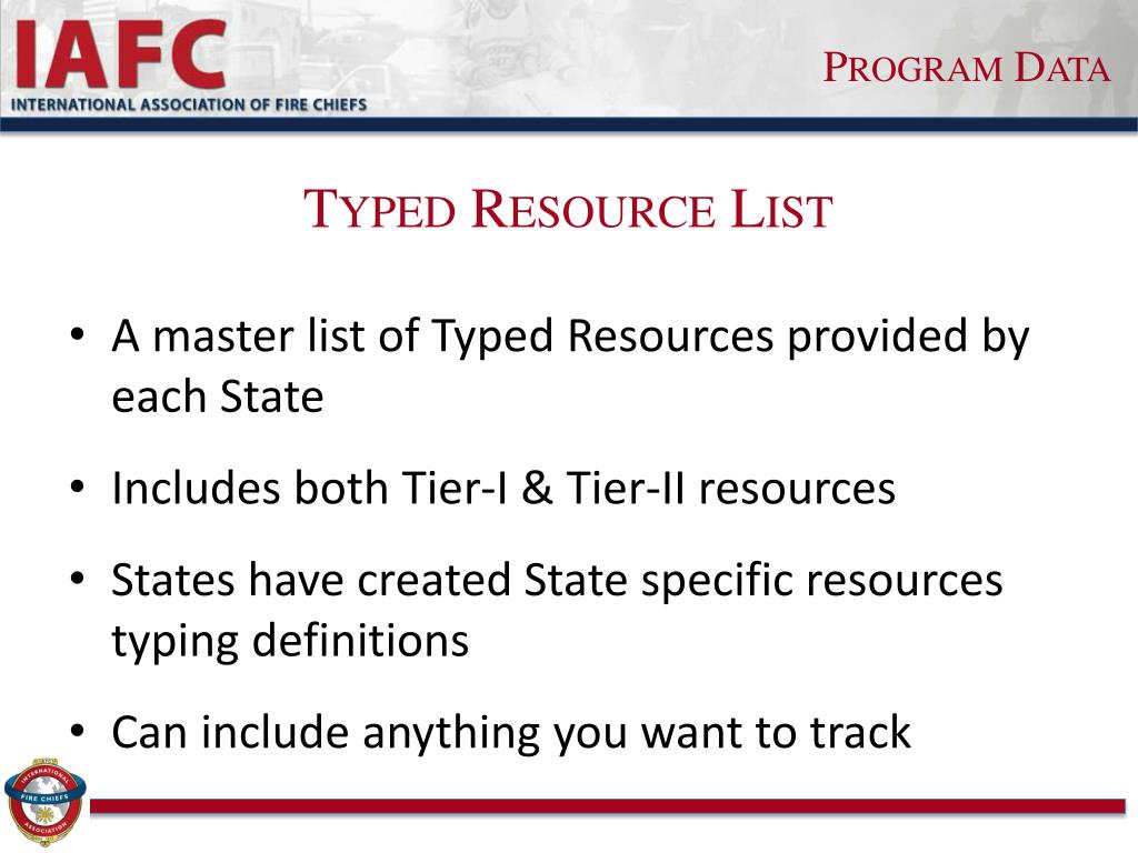 Program Data Typed Resource List • A master list of Typed Resources provided by each State • Includes both Tier-I & Tier-II resources • States have created State specific resources typing definitions • Can include anything you want to track
