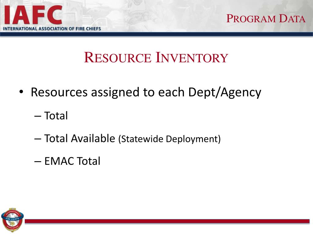 Program Data Resource Inventory • Resources assigned to each Dept/Agency • Total • Total Available (Statewide Deployment) • EMAC Total