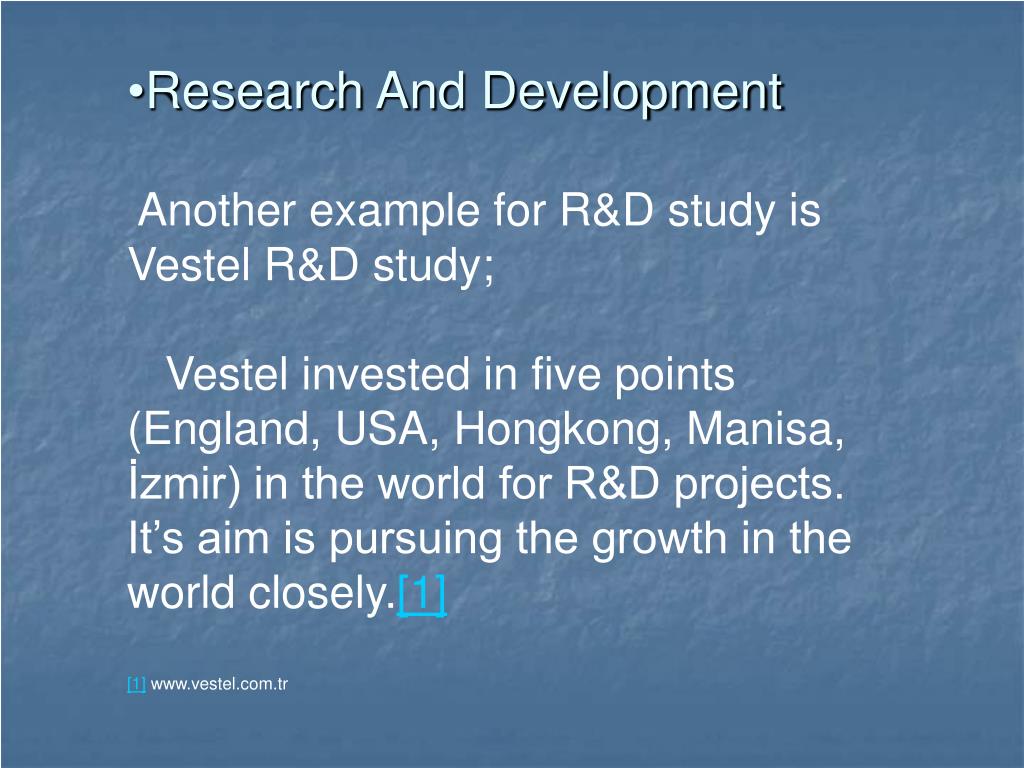 Research And Development • Another example for R&D study is Vestel R&D study; • Vestel invested in five points (England, USA, Hongkong, Manisa, İzmir) in the world for R&D projects. It’s aim is pursuing the growth in the world closely.[1] • [1] www.vestel.com.tr