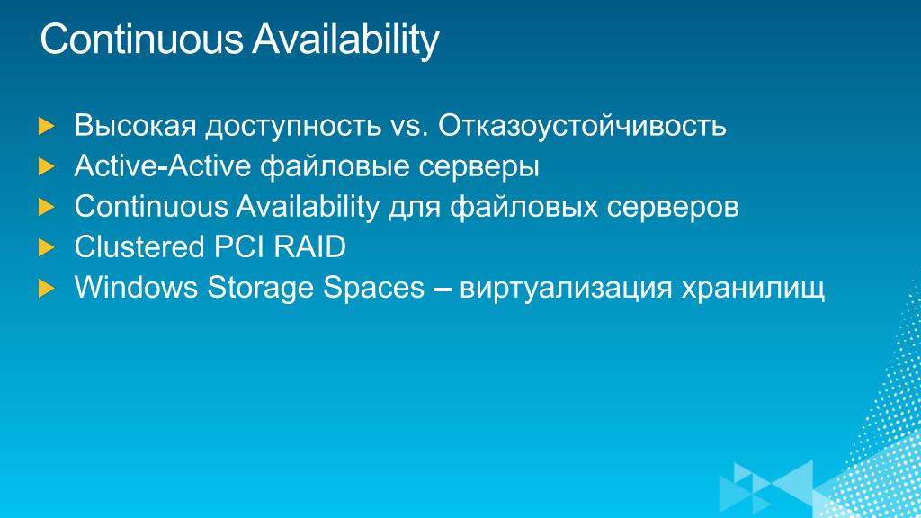 Continuous Availability • Высокая доступность vs. Отказоустойчивость • Active-Active файловые серверы • Continuous Availability для файловых серверов • Clustered PCI RAID • Windows Storage Spaces – виртуализация хранилищ