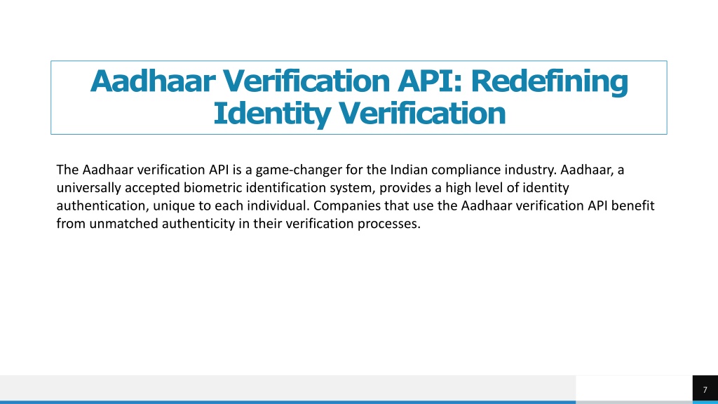 Aadhaar Verification API: Redefining Identity Verification The Aadhaar verification API is a game-changer for the Indian compliance industry. Aadhaar, a universally accepted biometric identification system, provides a high level of identity authentication, unique to each individual. Companies that use the Aadhaar verification API benefit from unmatched authenticity in their verification processes.