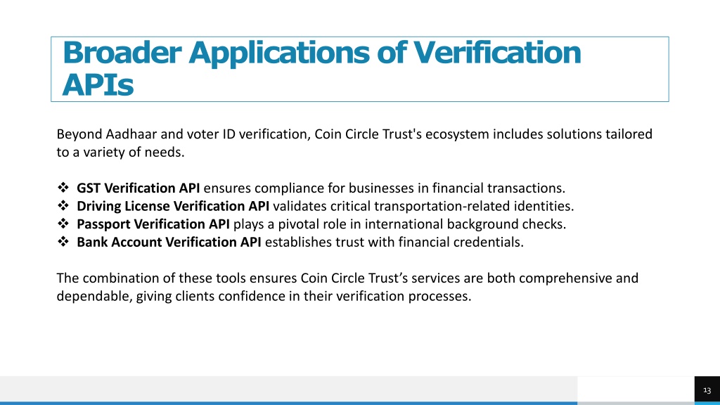 Broader Applications of Verification APIs • Beyond Aadhaar and voter ID verification, Coin Circle Trust's ecosystem includes solutions tailored to a variety of needs. • GST Verification API ensures compliance for businesses in financial transactions. • Driving License Verification API validates critical transportation-related identities. • Passport Verification API plays a pivotal role in international background checks. • Bank Account Verification API establishes trust with financial credentials. • The combination of these tools ensures Coin Circle Trust’s services are both comprehensive and dependable, giving clients confidence in their verification processes.