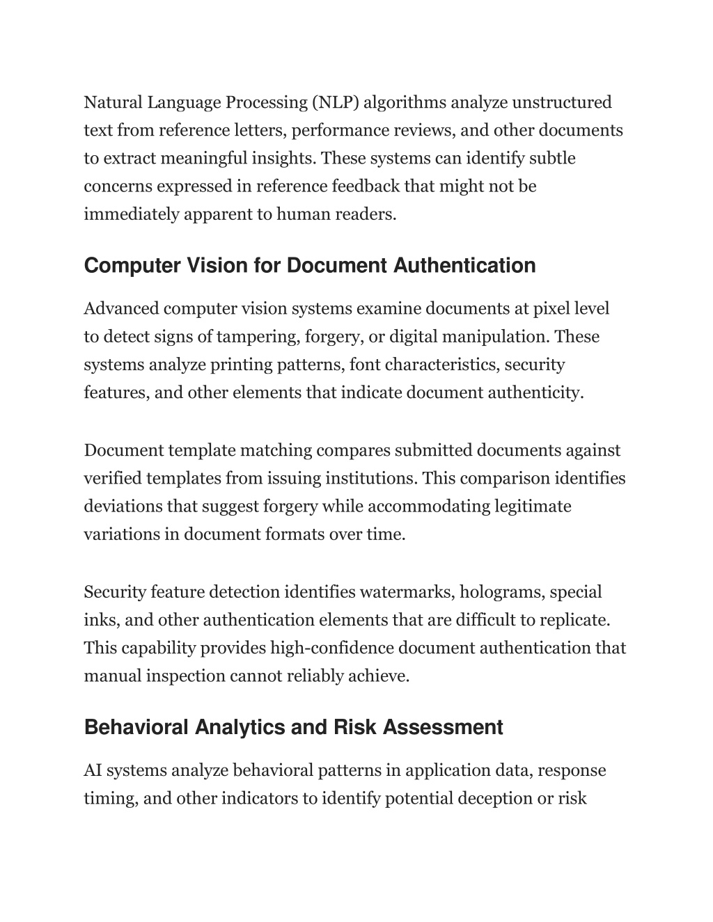 Natural Language Processing (NLP) algorithms analyze unstructured text from reference letters, performance reviews, and other documents to extract meaningful insights. These systems can identify subtle concerns expressed in reference feedback that might not be immediately apparent to human readers. Computer Vision for Document Authentication Advanced computer vision systems examine documents at pixel level to detect signs of tampering, forgery, or digital manipulation. These systems analyze printing patterns, font characteristics, security features, and other elements that indicate document authenticity. Document template matching compares submitted documents against verified templates from issuing institutions. This comparison identifies deviations that suggest forgery while accommodating legitimate variations in document formats over time. Security feature detection identifies watermarks, holograms, special inks, and other authentication elements that are difficult to replicate. This capability provides high-confidence document authentication that manual inspection cannot reliably achieve. Behavioral Analytics and Risk Assessment AI systems analyze behavioral patterns in application data, response timing, and other indicators to identify potential deception or risk