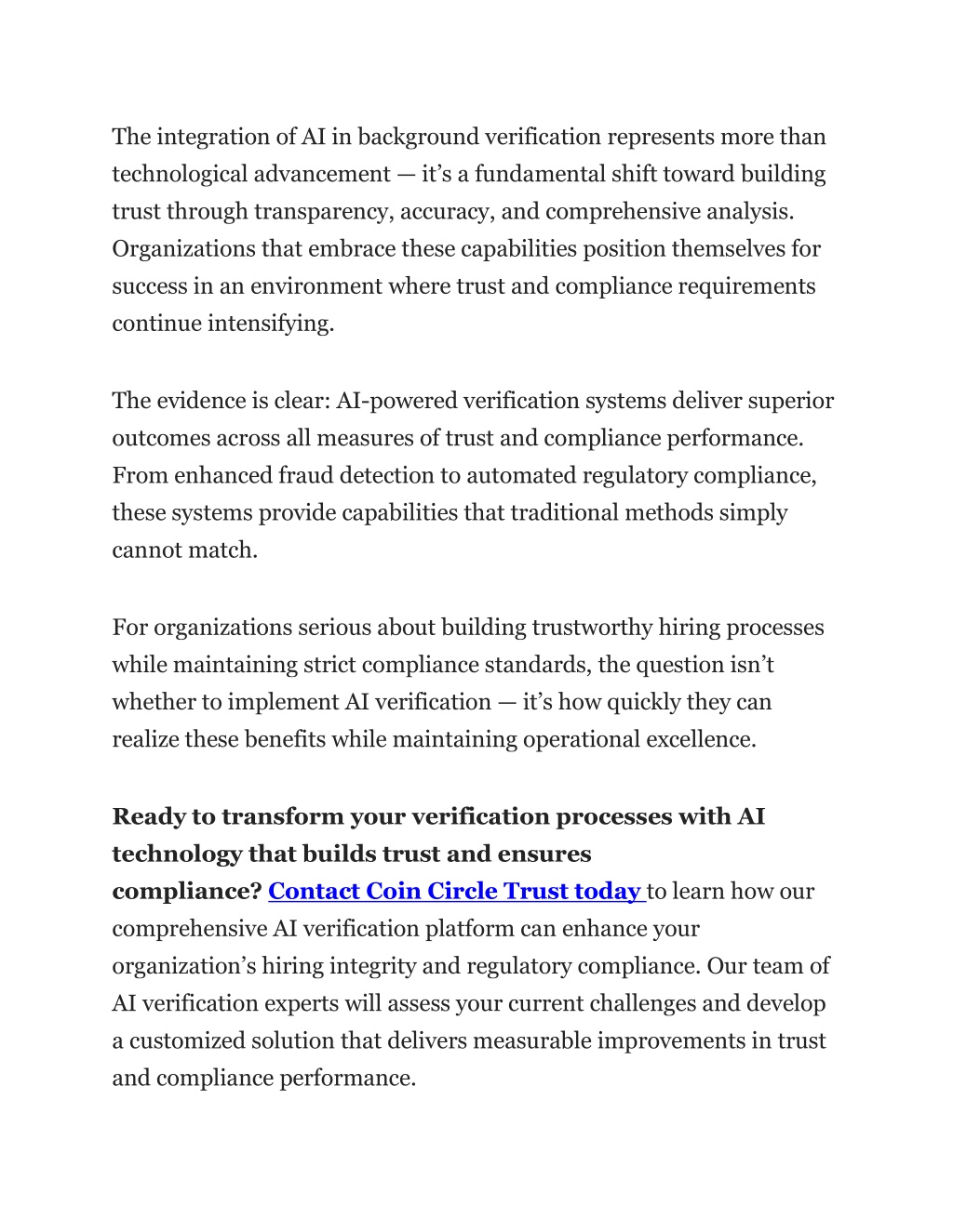 The integration of AI in background verification represents more than technological advancement —it’s a fundamental shift toward building trust through transparency, accuracy, and comprehensive analysis. Organizations that embrace these capabilities position themselves for success in an environment where trust and compliance requirements continue intensifying. The evidence is clear: AI-powered verification systems deliver superior outcomes across all measures of trust and compliance performance. From enhanced fraud detection to automated regulatory compliance, these systems provide capabilities that traditional methods simply cannot match. For organizations serious about building trustworthy hiring processes while maintaining strict compliance standards, the question isn’t whether to implement AI verification —it’s how quickly they can realize these benefits while maintaining operational excellence. Ready to transform your verification processes with AI technology that builds trust and ensures compliance?Contact Coin Circle Trust today to learn how our comprehensive AI verification platform can enhance your organization’s hiring integrity and regulatory compliance. Our team of AI verification experts will assess your current challenges and develop a customized solution that delivers measurable improvements in trust and compliance performance.