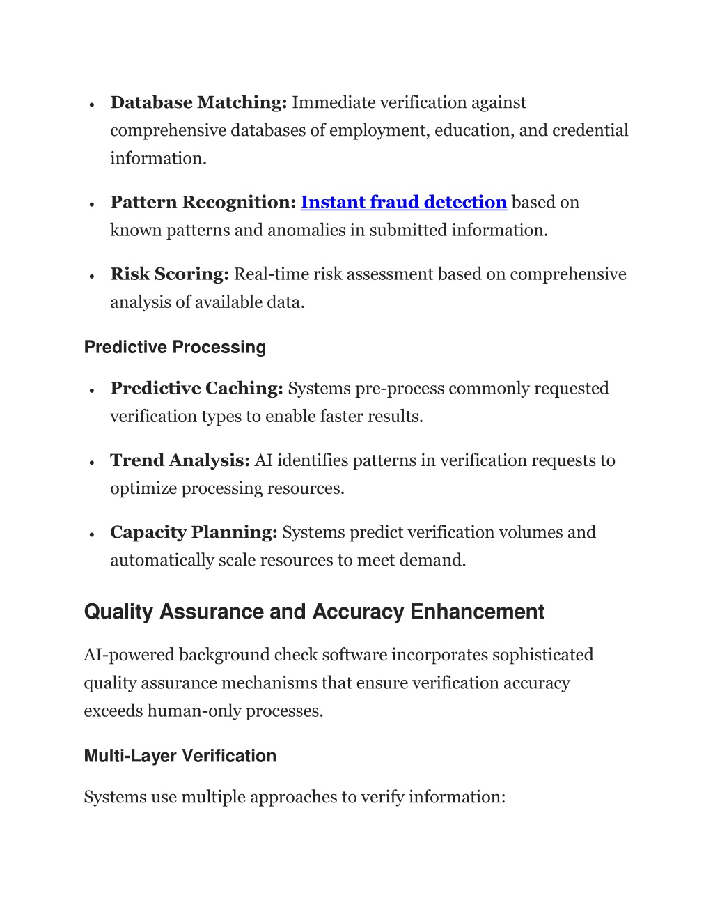 •Database Matching: Immediate verification against comprehensive databases of employment, education, and credential information. •Pattern Recognition:Instant fraud detection based on known patterns and anomalies in submitted information. •Risk Scoring: Real-time risk assessment based on comprehensive analysis of available data. Predictive Processing •Predictive Caching: Systems pre-process commonly requested verification types to enable faster results. •Trend Analysis: AI identifies patterns in verification requests to optimize processing resources. •Capacity Planning: Systems predict verification volumes and automatically scale resources to meet demand. Quality Assurance and Accuracy Enhancement AI-powered background check software incorporates sophisticated quality assurance mechanisms that ensure verification accuracy exceeds human-only processes. Multi-Layer Verification Systems use multiple approaches to verify information: