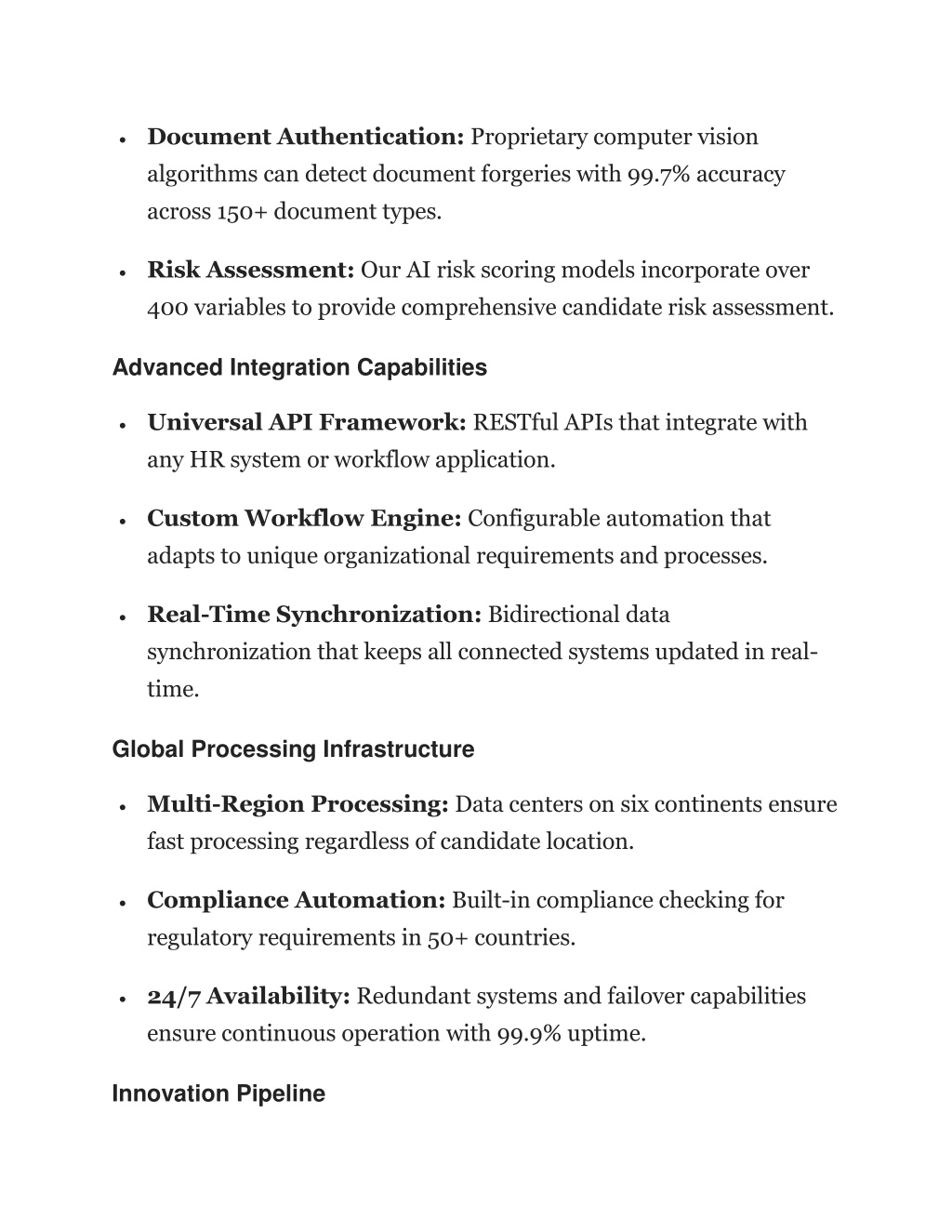•Document Authentication: Proprietary computer vision algorithms can detect document forgeries with 99.7% accuracy across 150+ document types. •Risk Assessment: Our AI risk scoring models incorporate over 400 variables to provide comprehensive candidate risk assessment. Advanced Integration Capabilities •Universal API Framework: RESTful APIs that integrate with any HR system or workflow application. •Custom Workflow Engine: Configurable automation that adapts to unique organizational requirements and processes. •Real-Time Synchronization: Bidirectional data synchronization that keeps all connected systems updated in real- time. Global Processing Infrastructure •Multi-Region Processing: Data centers on six continents ensure fast processing regardless of candidate location. •Compliance Automation: Built-in compliance checking for regulatory requirements in 50+ countries. •24/7 Availability: Redundant systems and failover capabilities ensure continuous operation with 99.9% uptime. Innovation Pipeline