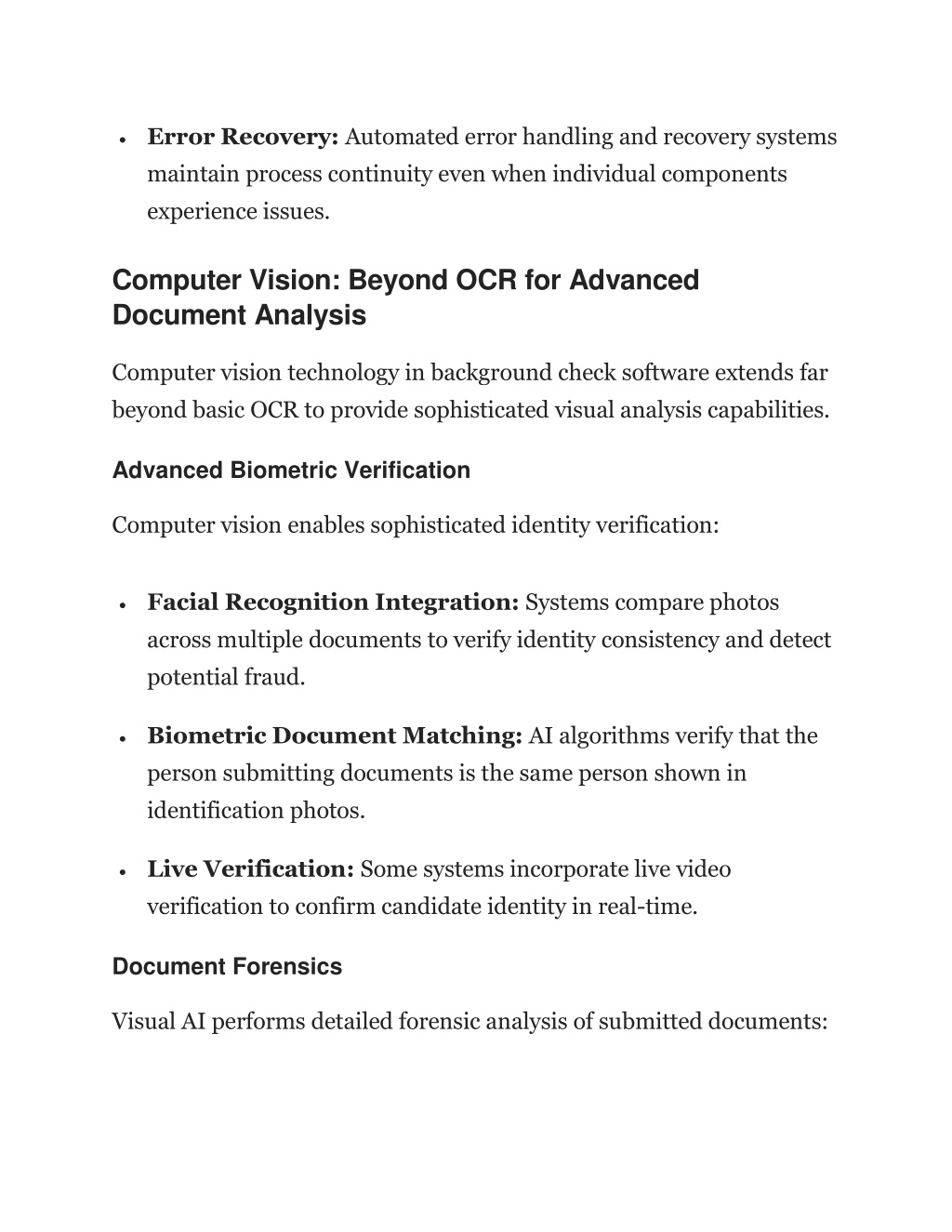 •Error Recovery: Automated error handling and recovery systems maintain process continuity even when individual components experience issues. Computer Vision: Beyond OCR for Advanced Document Analysis Computer vision technology in background check software extends far beyond basic OCR to provide sophisticated visual analysis capabilities. Advanced Biometric Verification Computer vision enables sophisticated identity verification: •Facial Recognition Integration: Systems compare photos across multiple documents to verify identity consistency and detect potential fraud. •Biometric Document Matching: AI algorithms verify that the person submitting documents is the same person shown in identification photos. •Live Verification: Some systems incorporate live video verification to confirm candidate identity in real-time. Document Forensics Visual AI performs detailed forensic analysis of submitted documents: