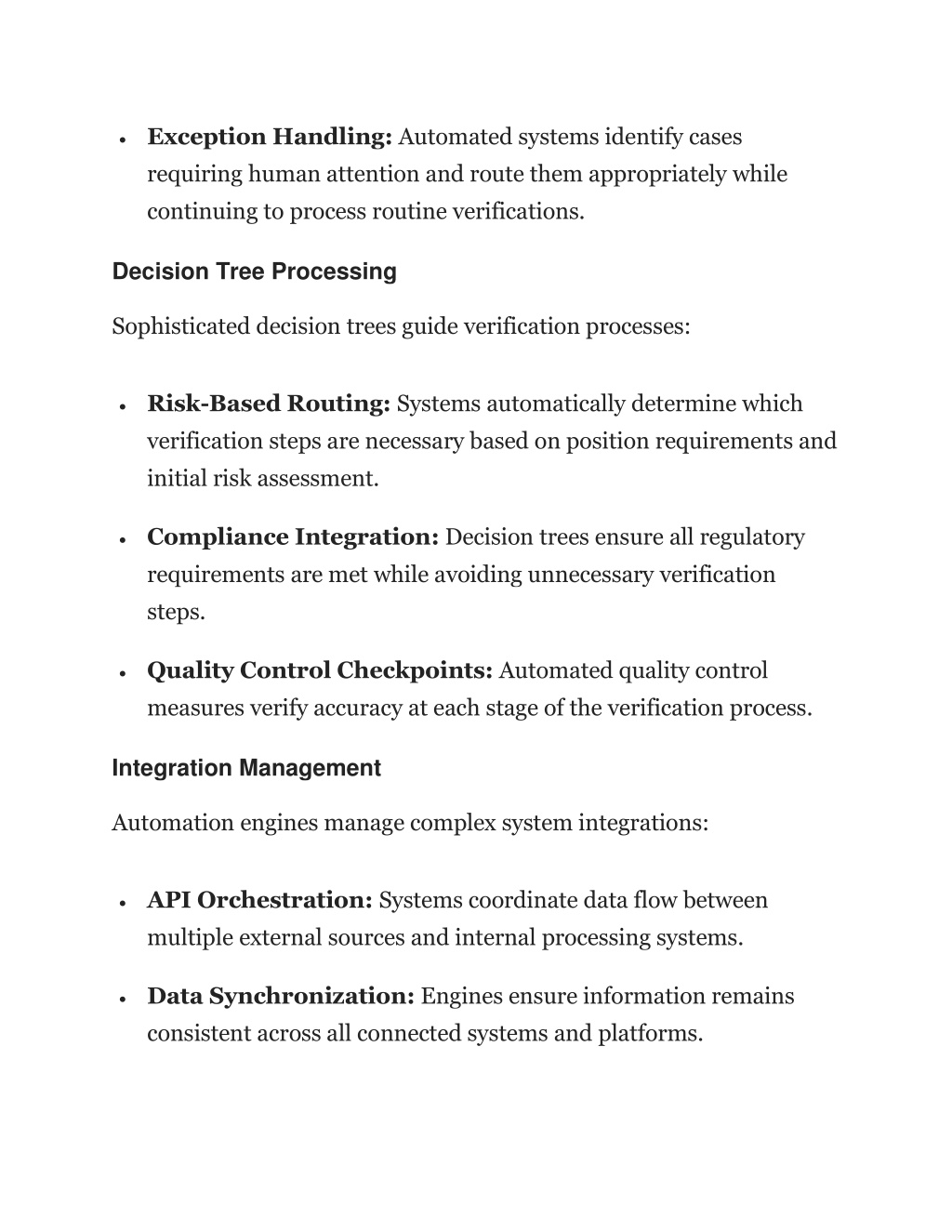 •Exception Handling: Automated systems identify cases requiring human attention and route them appropriately while continuing to process routine verifications. Decision Tree Processing Sophisticated decision trees guide verification processes: •Risk-Based Routing: Systems automatically determine which verification steps are necessary based on position requirements and initial risk assessment. •Compliance Integration: Decision trees ensure all regulatory requirements are met while avoiding unnecessary verification steps. •Quality Control Checkpoints: Automated quality control measures verify accuracy at each stage of the verification process. Integration Management Automation engines manage complex system integrations: •API Orchestration: Systems coordinate data flow between multiple external sources and internal processing systems. •Data Synchronization: Engines ensure information remains consistent across all connected systems and platforms.