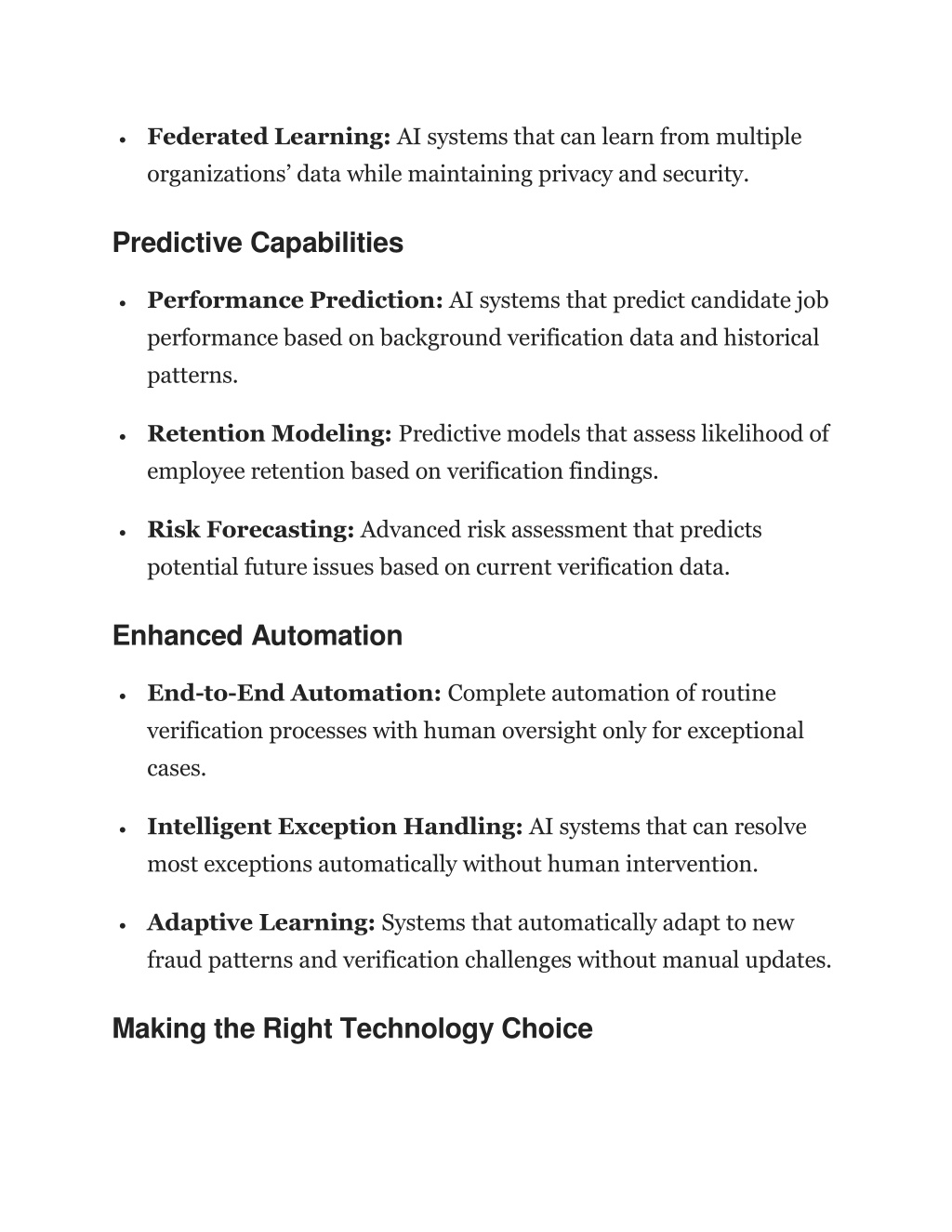 •Federated Learning: AI systems that can learn from multiple organizations’ data while maintaining privacy and security. Predictive Capabilities •Performance Prediction: AI systems that predict candidate job performance based on background verification data and historical patterns. •Retention Modeling: Predictive models that assess likelihood of employee retention based on verification findings. •Risk Forecasting: Advanced risk assessment that predicts potential future issues based on current verification data. Enhanced Automation •End-to-End Automation: Complete automation of routine verification processes with human oversight only for exceptional cases. •Intelligent Exception Handling: AI systems that can resolve most exceptions automatically without human intervention. •Adaptive Learning: Systems that automatically adapt to new fraud patterns and verification challenges without manual updates. Making the Right Technology Choice