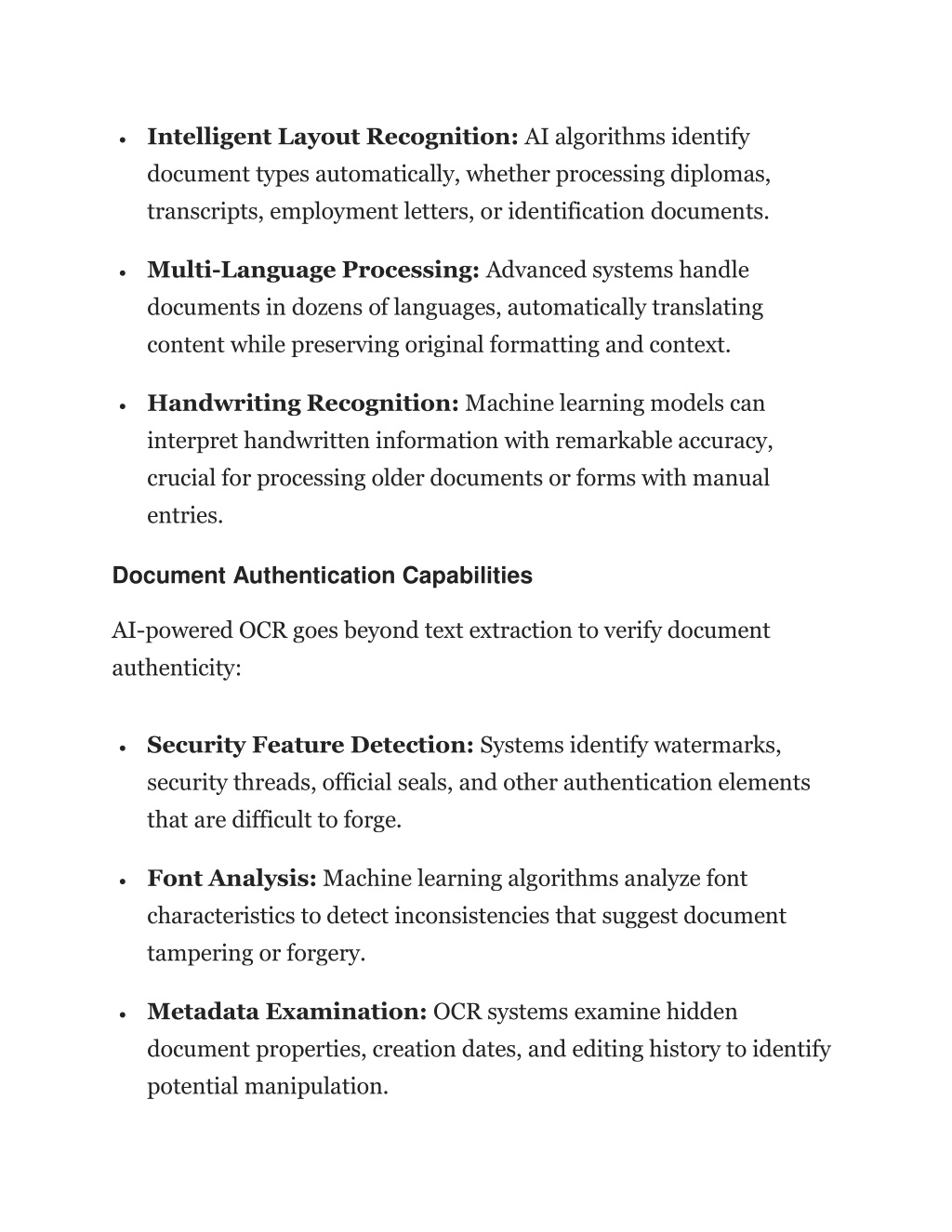 •Intelligent Layout Recognition: AI algorithms identify document types automatically, whether processing diplomas, transcripts, employment letters, or identification documents. •Multi-Language Processing: Advanced systems handle documents in dozens of languages, automatically translating content while preserving original formatting and context. •Handwriting Recognition: Machine learning models can interpret handwritten information with remarkable accuracy, crucial for processing older documents or forms with manual entries. Document Authentication Capabilities AI-powered OCR goes beyond text extraction to verify document authenticity: •Security Feature Detection: Systems identify watermarks, security threads, official seals, and other authentication elements that are difficult to forge. •Font Analysis: Machine learning algorithms analyze font characteristics to detect inconsistencies that suggest document tampering or forgery. •Metadata Examination: OCR systems examine hidden document properties, creation dates, and editing history to identify potential manipulation.