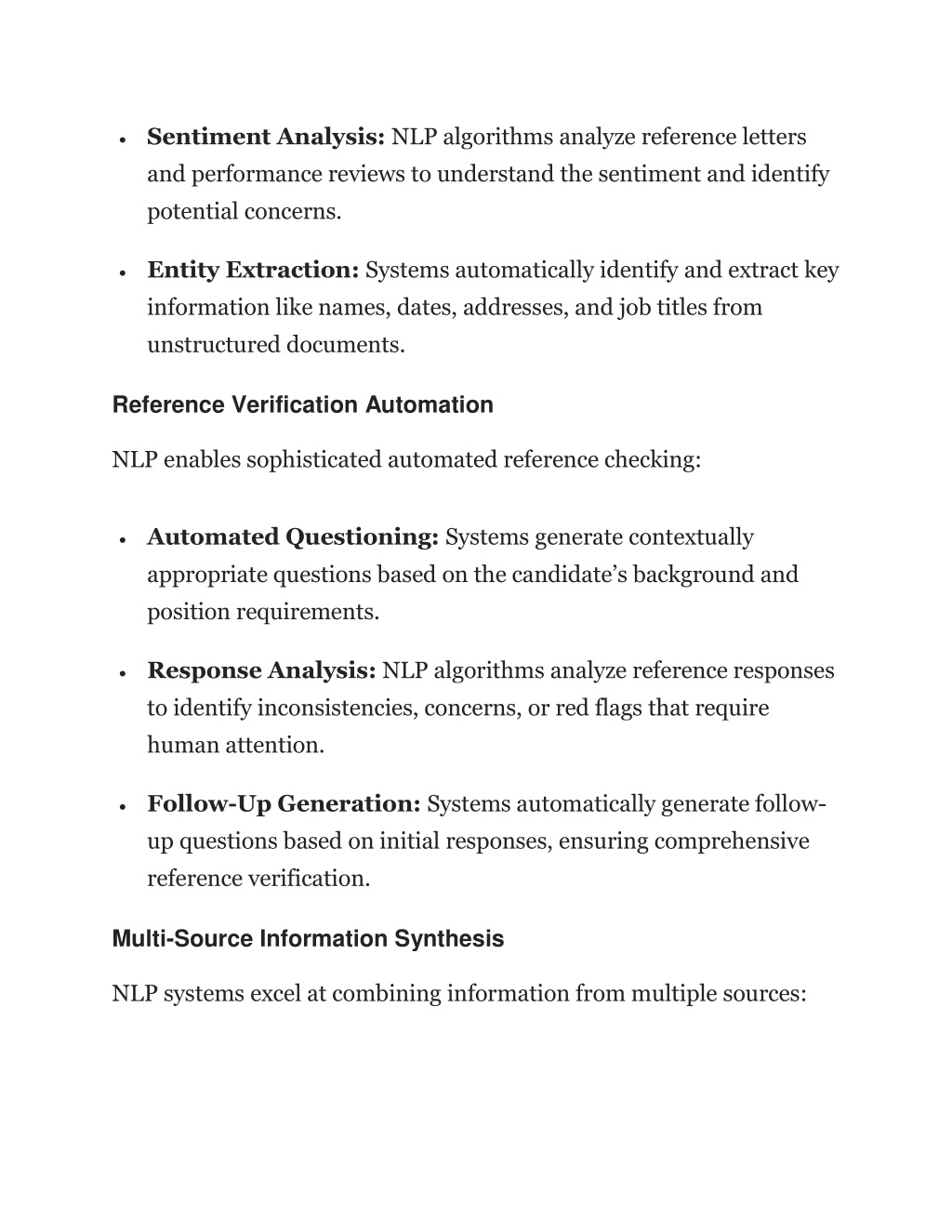 •Sentiment Analysis: NLP algorithms analyze reference letters and performance reviews to understand the sentiment and identify potential concerns. •Entity Extraction: Systems automatically identify and extract key information like names, dates, addresses, and job titles from unstructured documents. Reference Verification Automation NLP enables sophisticated automated reference checking: •Automated Questioning: Systems generate contextually appropriate questions based on the candidate’s background and position requirements. •Response Analysis: NLP algorithms analyze reference responses to identify inconsistencies, concerns, or red flags that require human attention. •Follow-Up Generation: Systems automatically generate follow- up questions based on initial responses, ensuring comprehensive reference verification. Multi-Source Information Synthesis NLP systems excel at combining information from multiple sources: