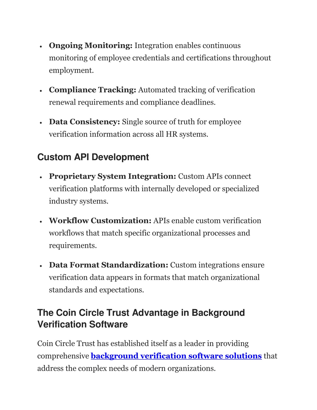 •Ongoing Monitoring: Integration enables continuous monitoring of employee credentials and certifications throughout employment. •Compliance Tracking: Automated tracking of verification renewal requirements and compliance deadlines. •Data Consistency: Single source of truth for employee verification information across all HR systems. Custom API Development •Proprietary System Integration: Custom APIs connect verification platforms with internally developed or specialized industry systems. •Workflow Customization: APIs enable custom verification workflows that match specific organizational processes and requirements. •Data Format Standardization: Custom integrations ensure verification data appears in formats that match organizational standards and expectations. The Coin Circle Trust Advantage in Background Verification Software Coin Circle Trust has established itself as a leader in providing comprehensive background verification software solutions that address the complex needs of modern organizations.