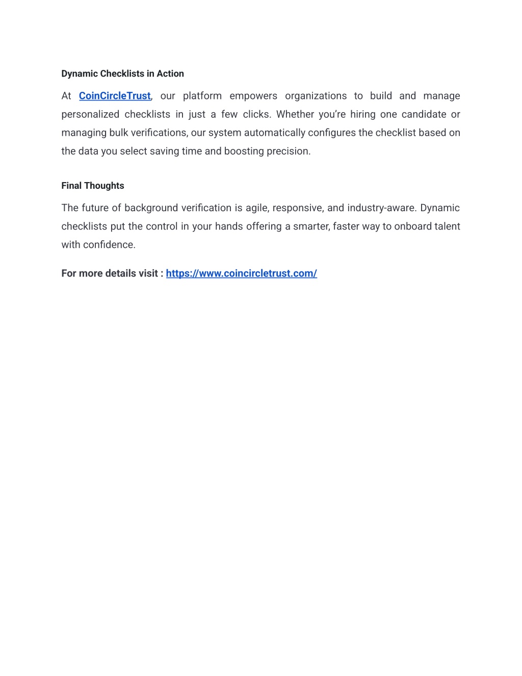 Dynamic checklists let businesses customize background checks for every role and industryu2014making hiring faster, smarter, and more compliant. For more details visit : https://www.coincircletrust.com/<br>