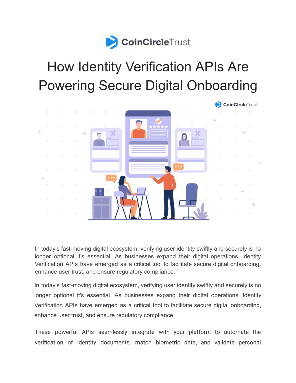 Learn how Identity Verification APIs enable secure, fast, and compliant digital onboardingu2014boosting trust, preventing fraud, and improving user experience. For more details visit : https://www.coincircletrust.com/