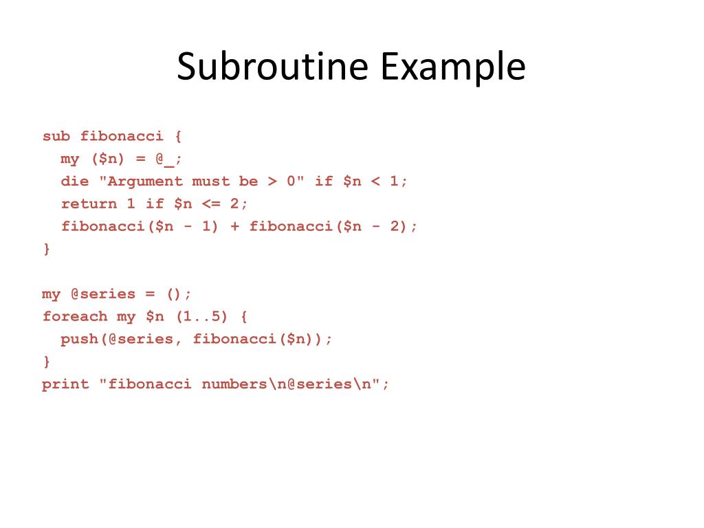 Subroutine Example sub fibonacci { my ($n) = @_; die "Argument must be > 0" if $n < 1; return 1 if $n <= 2; fibonacci($n - 1) + fibonacci($n - 2); } my @series = (); foreach my $n (1..5) { push(@series, fibonacci($n)); } print "fibonacci numbers\n@series\n";