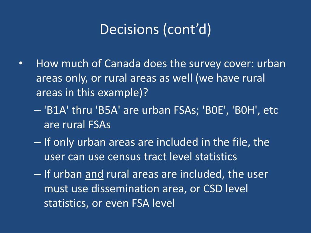 Decisions (cont’d) • How much of Canada does the survey cover: urban areas only, or rural areas as well (we have rural areas in this example)? • 'B1A' thru 'B5A' are urban FSAs; 'B0E', 'B0H', etc are rural FSAs • If only urban areas are included in the file, the user can use census tract level statistics • If urban and rural areas are included, the user must use dissemination area, or CSD level statistics, or even FSA level