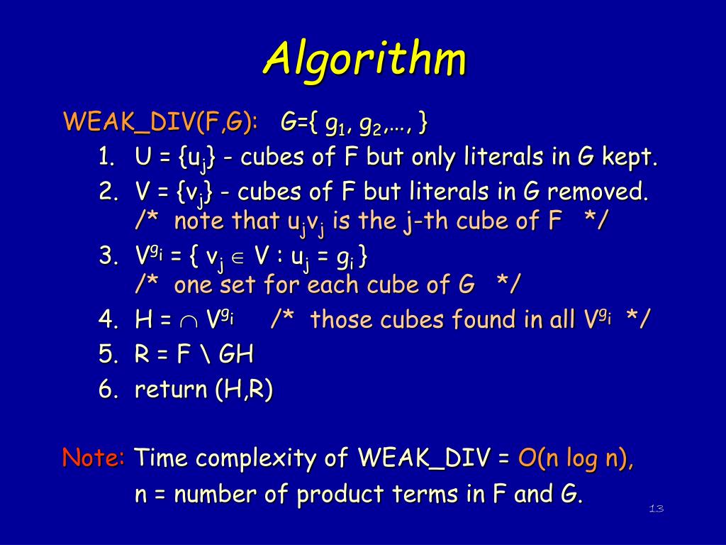 Algorithm WEAK_DIV(F,G): G={ g1, g2,…, } • U = {uj} - cubes of F but only literals in G kept. • V = {vj} - cubes of F but literals in G removed./* note that ujvj is the j-th cube of F */ • Vgi = { vj V : uj = gi }/* one set for each cube of G */ • H = Vgi/* those cubes found in all Vgi*/ • R = F \ GH • return (H,R) Note: Time complexity of WEAK_DIV = O(n log n), n = number of product terms in F and G.