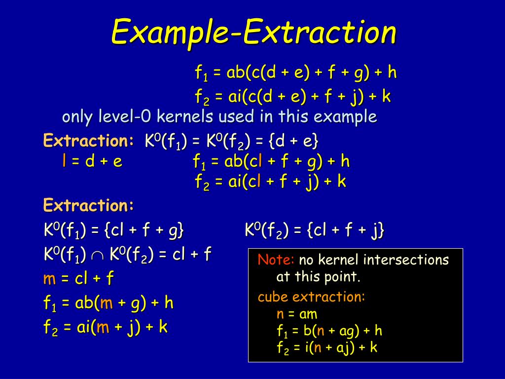 Example-Extraction f1 = ab(c(d + e) + f + g) + h f2 = ai(c(d + e) + f + j) + konly level-0 kernels used in this example Extraction: K0(f1) = K0(f2) = {d + e}l = d + e f1 = ab(cl + f + g) + h f2 = ai(cl + f + j) + k Extraction: K0(f1) = {cl + f + g} K0(f2) = {cl + f + j} K0(f1) K0(f2) = cl + f m = cl + f f1 = ab(m + g) + h f2 = ai(m + j) + k Note: no kernel intersections at this point. cube extraction:n = amf1 = b(n + ag) + hf2 = i(n + aj) + k