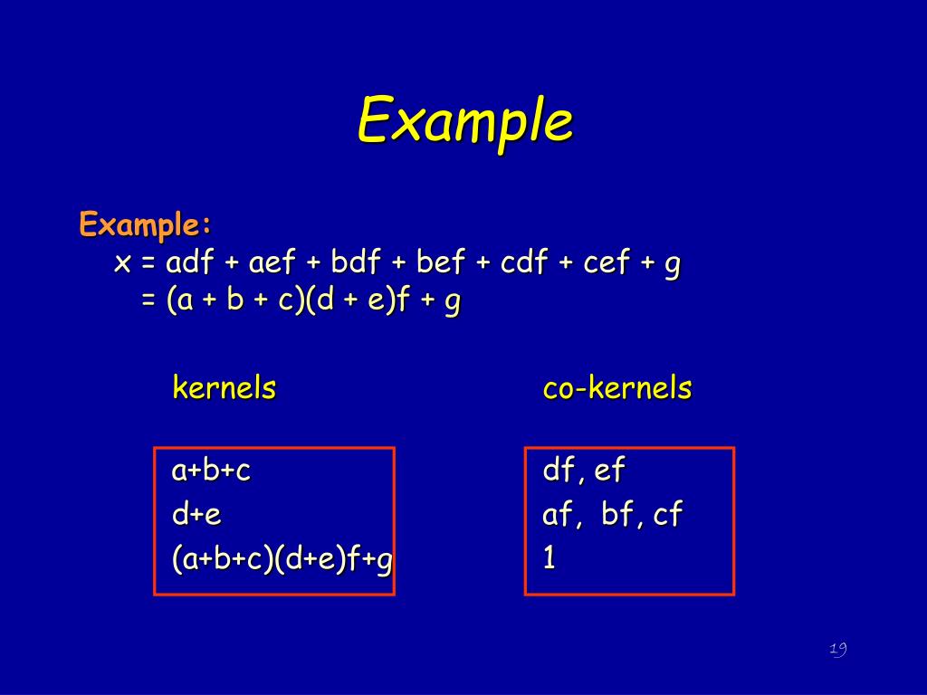 Example Example:x = adf + aef + bdf + bef + cdf + cef + g= (a + b + c)(d + e)f + g kernelsco-kernels a+b+c df, ef d+e af, bf, cf (a+b+c)(d+e)f+g 1