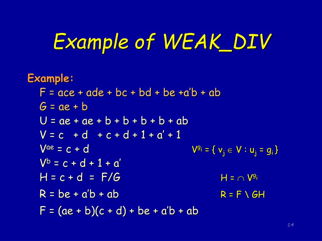 Example of WEAK_DIV Example:F = ace + ade + bc + bd + be +a’b + abG = ae + bU = ae + ae + b + b + b + b + abV = c + d + c + d + 1 + a’ + 1Vae = c + d Vgi = { vj V : uj = gi }Vb = c + d + 1 + a’H = c + d = F/G H = Vgi R = be + a’b + ab R = F \ GH F = (ae + b)(c + d) + be + a’b + ab