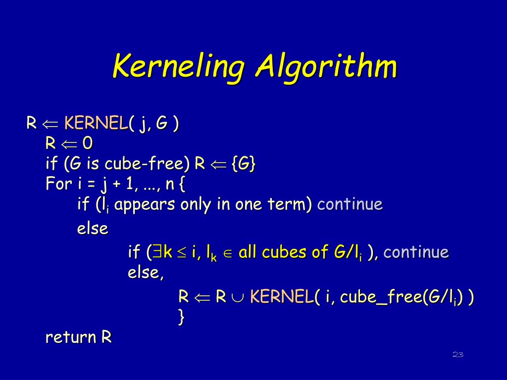 Kerneling Algorithm R KERNEL( j, G )R 0if (G is cube-free) R {G}For i = j + 1, ..., n { if (li appears only in one term) continue else if (k i, lk all cubes of G/li ), continue else, R R KERNEL( i, cube_free(G/li) ) }return R
