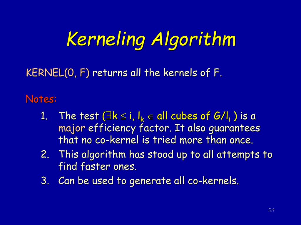 Kerneling Algorithm KERNEL(0, F) returns all the kernels of F. Notes: • The test (k i, lk all cubes of G/li) is a major efficiency factor. It also guarantees that no co-kernel is tried more than once. • This algorithm has stood up to all attempts to find faster ones. • Can be used to generate all co-kernels.