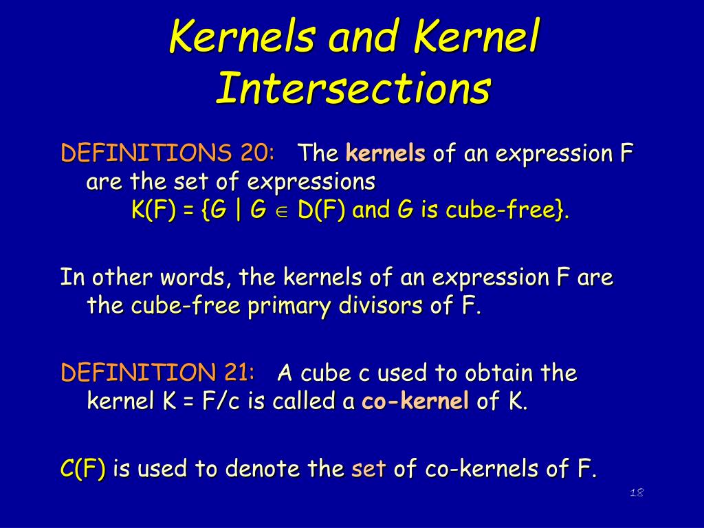 Kernels and Kernel Intersections DEFINITIONS 20: The kernels of an expression F are the set of expressionsK(F) = {G | G D(F) and G is cube-free}. In other words, the kernels of an expression F are the cube-free primary divisors of F. DEFINITION 21: A cube c used to obtain the kernel K = F/c is called a co-kernel of K. C(F) is used to denote the set of co-kernels of F.