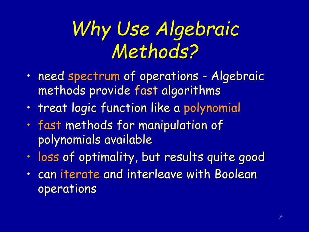 Why Use Algebraic Methods? • need spectrum of operations - Algebraic methods provide fast algorithms • treat logic function like a polynomial • fast methods for manipulation of polynomials available • loss of optimality, but results quite good • can iterate and interleave with Boolean operations