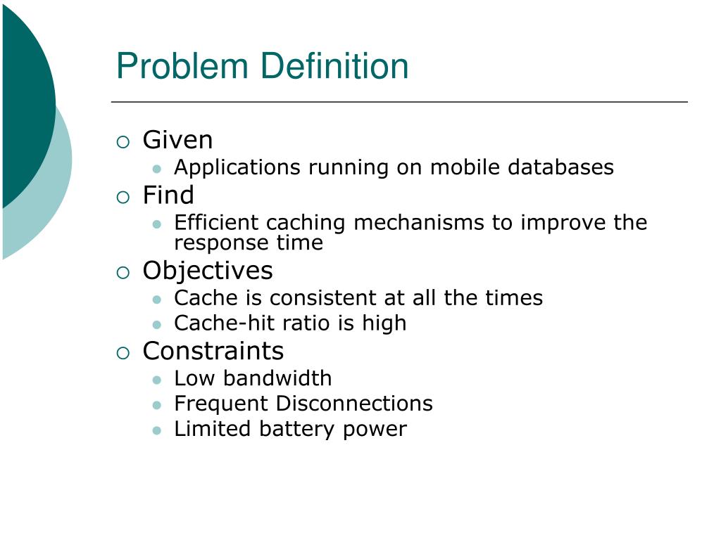 Problem Definition • Given • Applications running on mobile databases • Find • Efficient caching mechanisms to improve the response time • Objectives • Cache is consistent at all the times • Cache-hit ratio is high • Constraints • Low bandwidth • Frequent Disconnections • Limited battery power