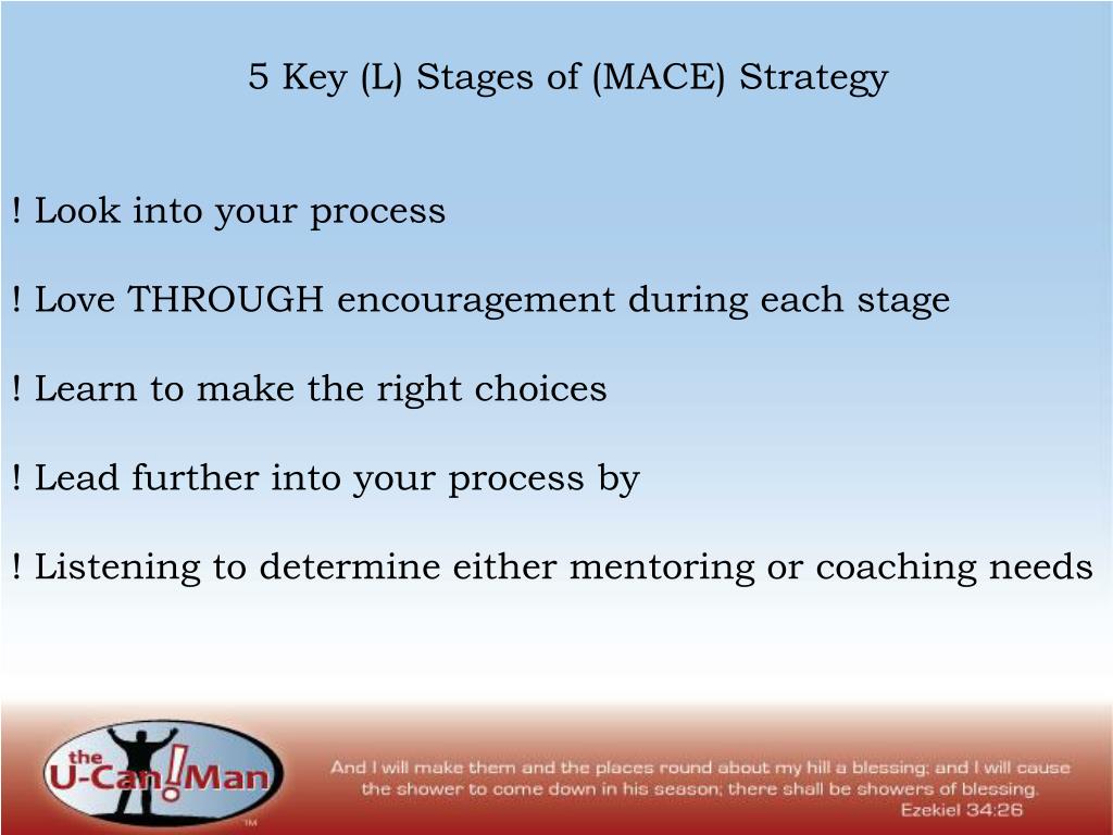 5 Key (L) Stages of (MACE) Strategy ! Look into your process ! Love THROUGH encouragement during each stage ! Learn to make the right choices ! Lead further into your process by ! Listening to determine either mentoring or coaching needs