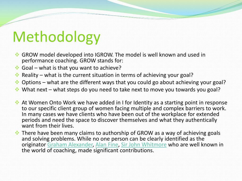 Methodology • GROW model developed into IGROW. The model is well known and used in performance coaching. GROW stands for: • Goal – what is that you want to achieve? • Reality – what is the current situation in terms of achieving your goal? • Options – what are the different ways that you could go about achieving your goal? • What next – what steps do you need to take next to move you towards you goal? • At Women Onto Work we have added in I for Identity as a starting point in response to our specific client group of women facing multiple and complex barriers to work. In many cases we have clients who have been out of the workplace for extended periods and need the space to discover themselves and what they authentically want from their lives. • There have been many claims to authorship of GROW as a way of achieving goals and solving problems. While no one person can be clearly identified as the originator Graham Alexander, Alan Fine, Sir John Whitmore who are well known in the world of coaching, made significant contributions.